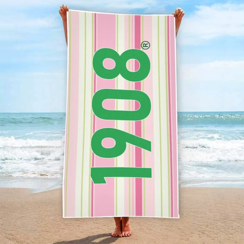 Alpha Kappa Alpha women’s beach towel featuring the iconic 1908 founding year in signature pink and green. This premium AKA paraphernalia piece is perfect for chapter beach outings, pool parties, and summer sisterhood events. Soft polyester construction makes it essential AKA apparel for any Soror. The D9 Standard.