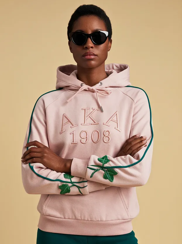 This Alpha Kappa Alpha hoodie for women showcases your 1908 legacy with classic embroidered detail in pink and green. Whether you’re heading to a step show or repping your letters around campus, this AKA sweatshirt delivers sorority pride with every wear. Exclusively at The D9 Standard.