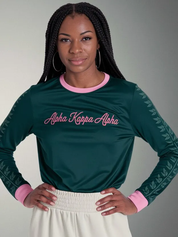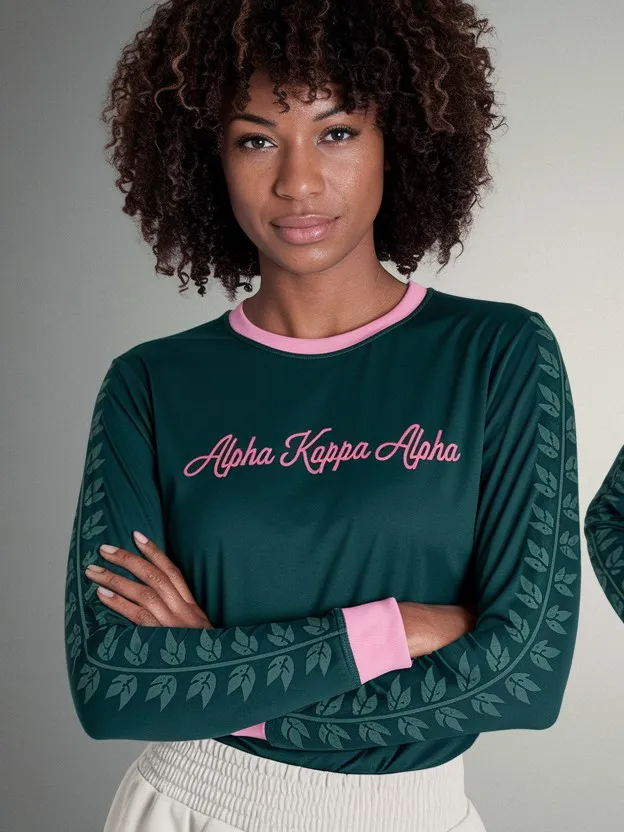 Alpha Kappa Alpha Heritage Elegance Long Sleeve Performance Shirt: breathable, stylish, showcasing your AKA pride. Perfect for sorority events, casual wear, or workouts.