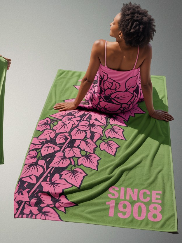 Alpha Kappa Alpha women’s beach towel bringing paradise vibes to every shoreline celebration. This premium AKA paraphernalia showcases your sorority’s signature pink and green in a lush ivy-inspired design that’s perfect for chapter beach trips and summer gatherings. Quality AKA apparel and accessories from The D9 Standard.