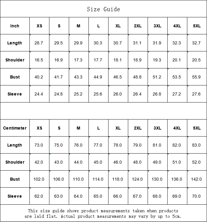 | Centimeter | XS | S | M | L | XL | 2XL | 3XL | 4XL | 5XL |