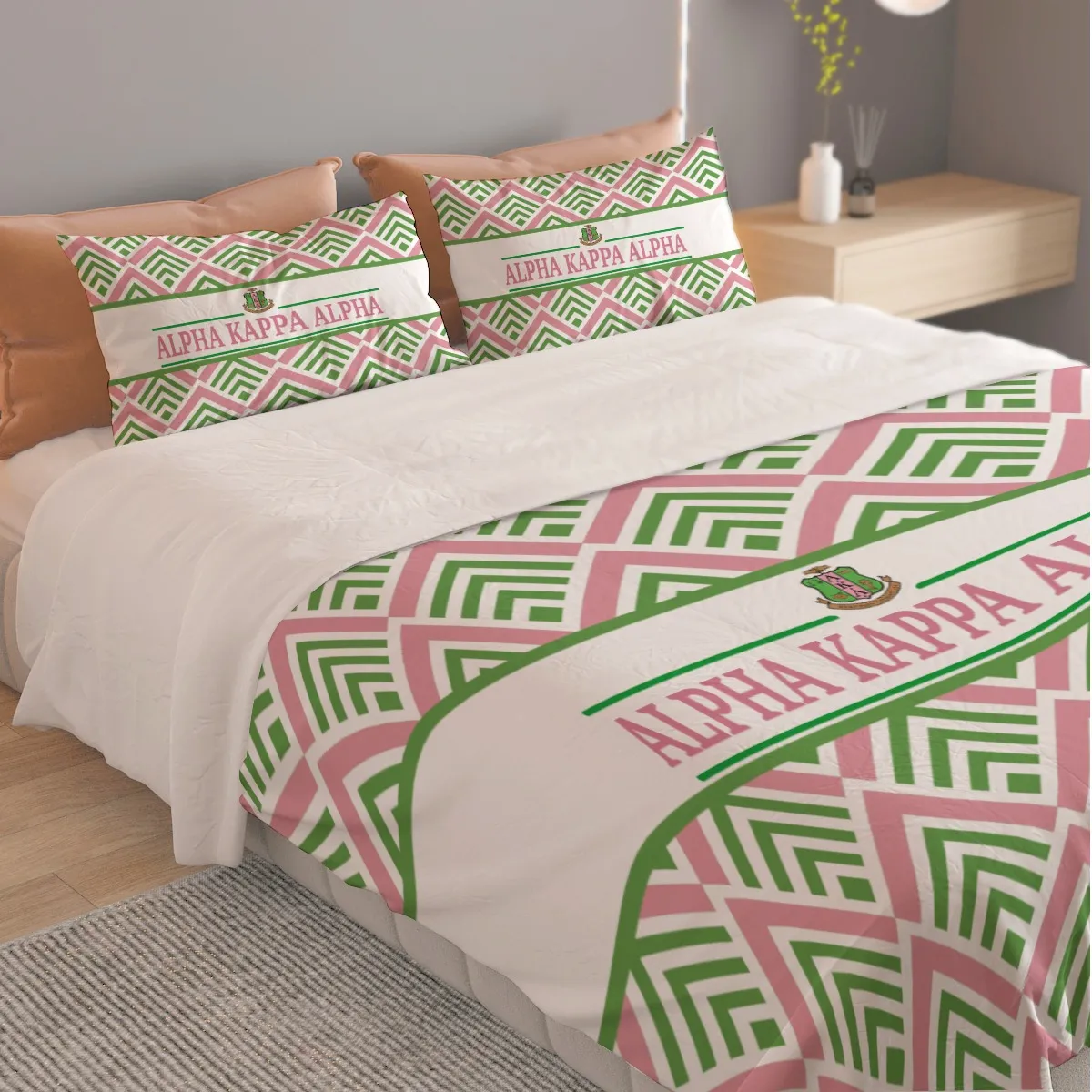 Elevate your sleep space with this Alpha Kappa Alpha women’s bedding set featuring the iconic pink and green scales design. This premium AKA paraphernalia adds sorority pride to your dorm or bedroom, making it ideal for showing out during homecoming season. Crafted from soft, breathable polyester exclusively at The D9 Standard.