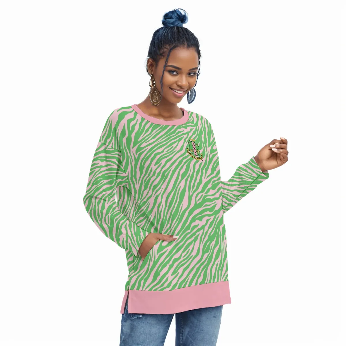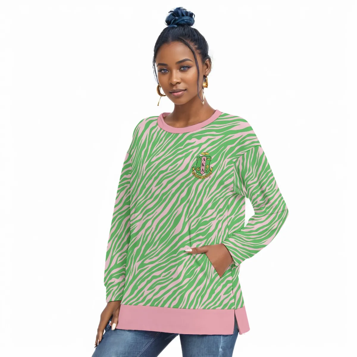 This Alpha Kappa Alpha sweatshirt brings sorority pride to every chapter meeting and campus stroll with its flattering side-split design. The soft polyester-spandex blend features your iconic pink and green, making this AKA hoodie essential paraphernalia for game days or weekend wear. Represent with The D9 Standard.