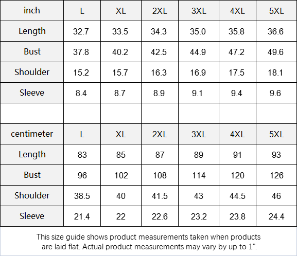 | inch | L | XL | 2XL | 3XL | 4XL | 5XL |