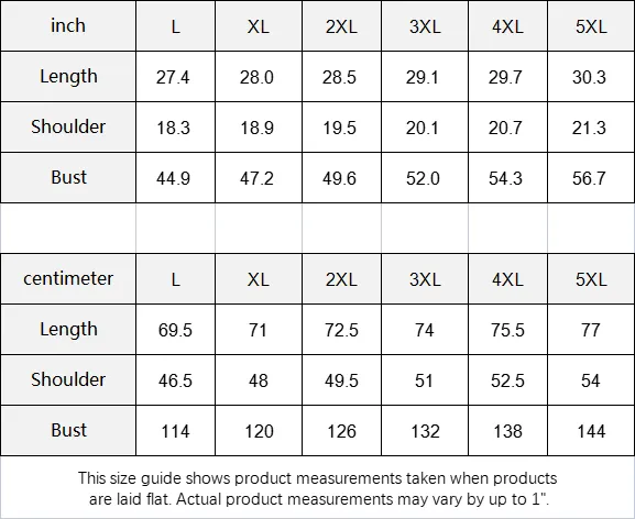 | inch | L | XL | 2XL | 3XL | 4XL | 5XL |
