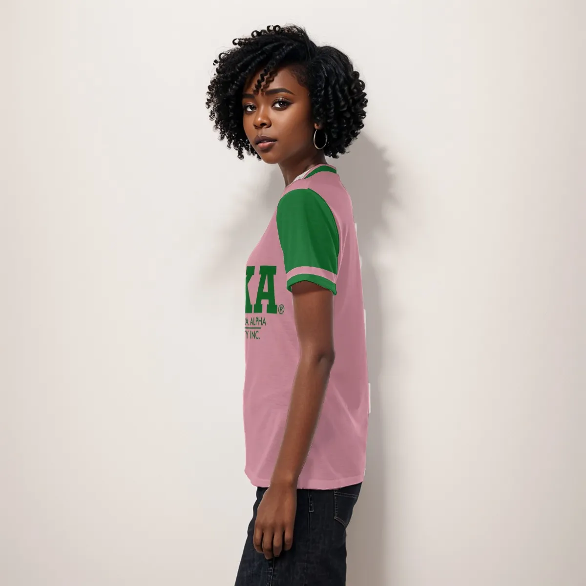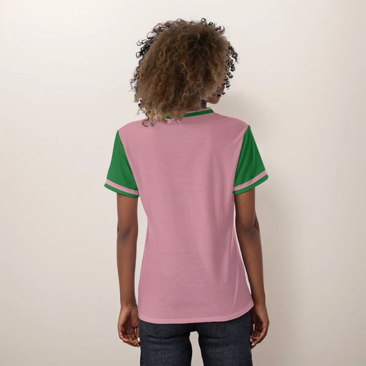 This Alpha Kappa Alpha women’s v-neck tee brings together classic AKA sorority style with everyday comfort. Crafted from a soft polyester-spandex blend in your signature pink and green, this aka shirt transitions seamlessly from chapter meetings to brunch with your sorors. Represent with pride through The D9 Standard.