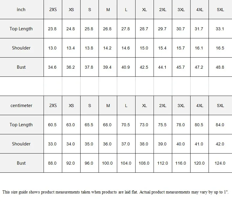 | inch | 2XS | XS | S | M | L | XL | 2XL | 3XL | 4XL | 5XL |