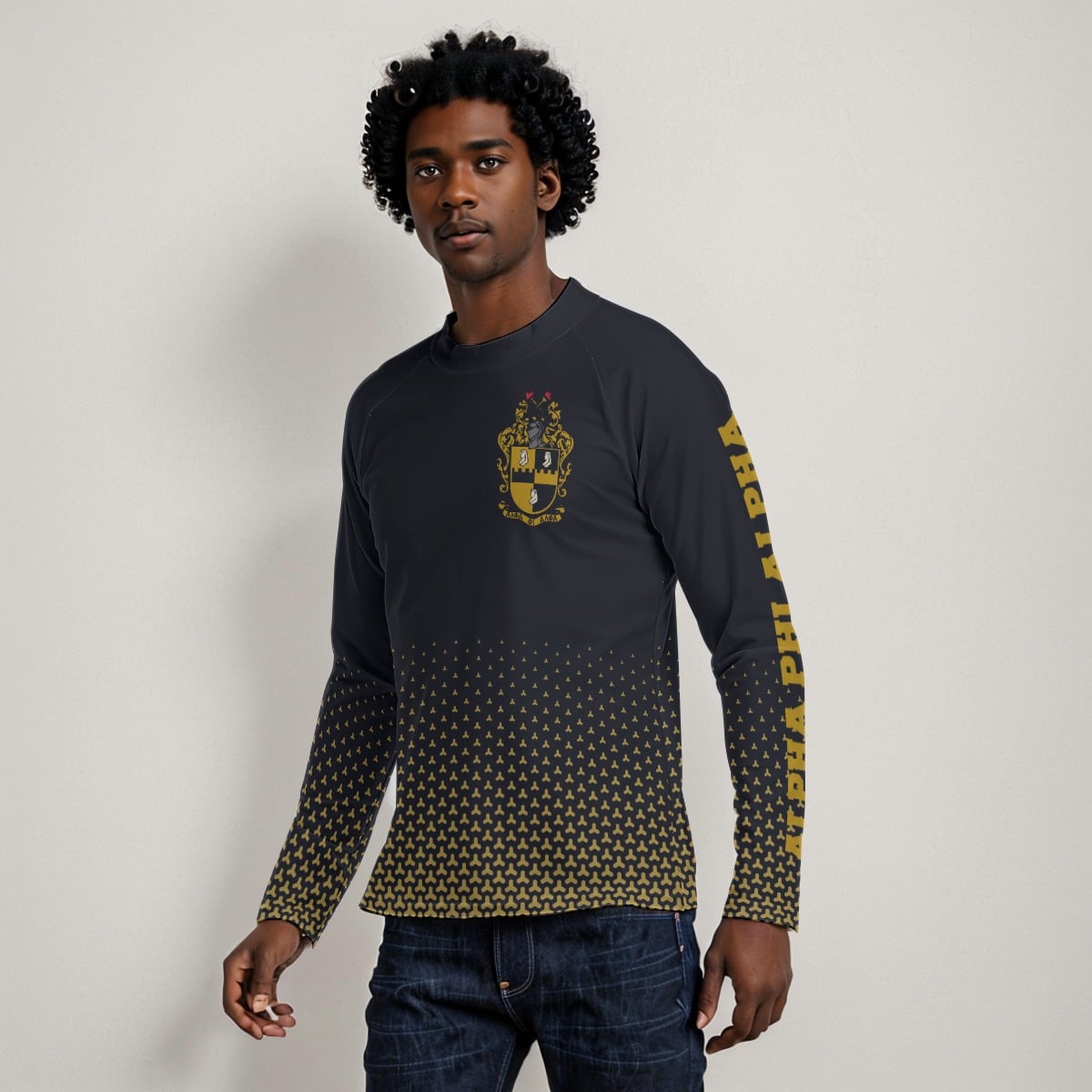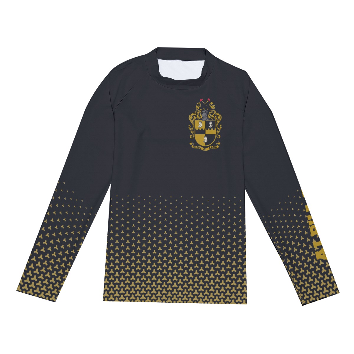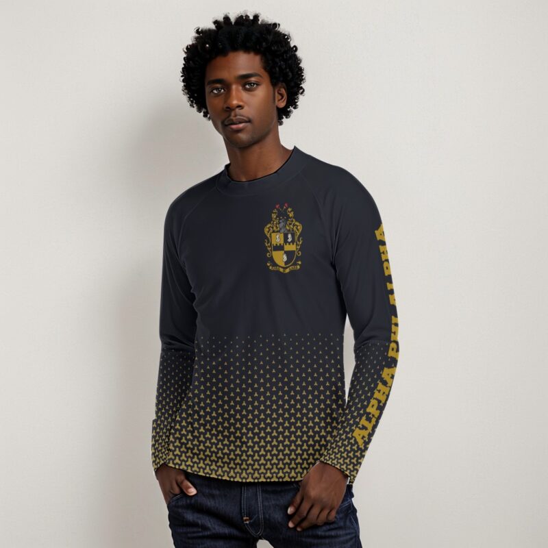 Alpha Phi Alpha men’s compression sport shirt engineered with a performance polyester-spandex blend in signature black and old gold. This athletic-fit Alpha Phi Alpha shirt transitions seamlessly from morning workouts to afternoon chapter meetings. Represent the Alphas with moisture-wicking comfort from The D9 Standard.