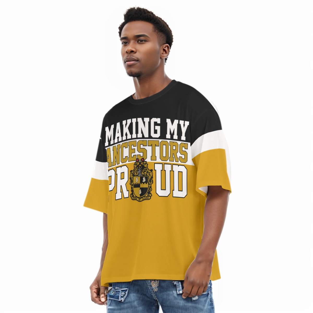 This Alpha Phi Alpha shirt features a relaxed drop shoulder design in the fraternity’s iconic black and old gold colors. Made from a comfortable polyester-spandex blend, it’s ideal for chapter meetings, campus wear, or as one of your go-to alpha phi alpha probate gifts. Represent the Alphas with pride from The D9 Standard.