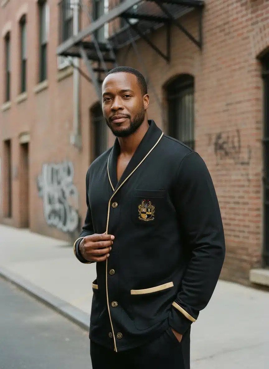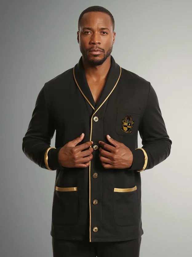 Alpha Phi Alpha men’s cardigan sweater crafted in signature black and old gold, featuring embroidered Greek letters for an executive look. This Alpha Phi Alpha cardigan brings refined style to chapter meetings, professional networking events, and campus gatherings. Exceptional quality from The D9 Standard.