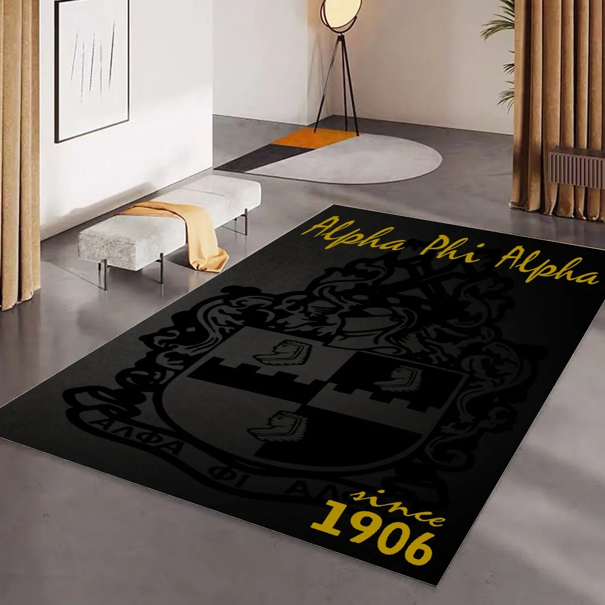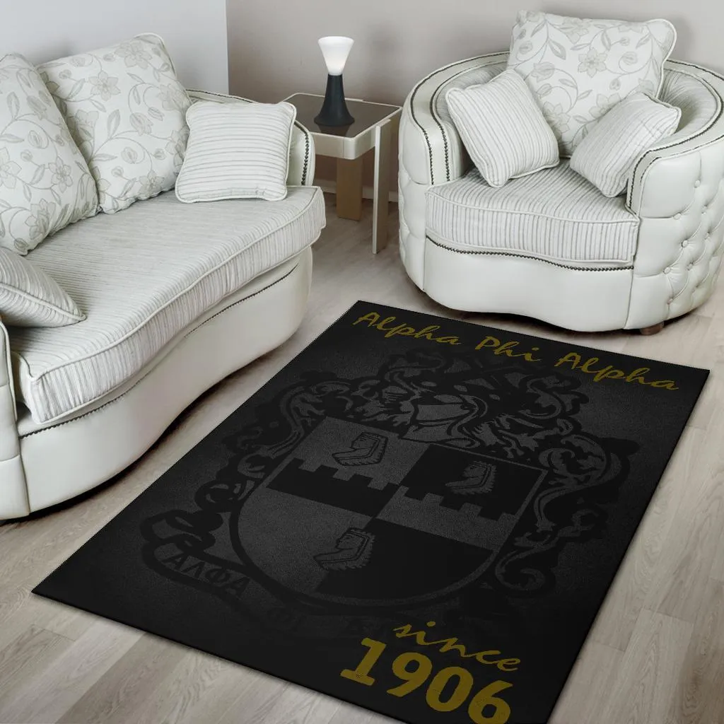 Alpha Phi Alpha area rug showcasing the fraternity’s iconic 1906 founding year in black and old gold. This polyester floor mat makes an excellent addition to alpha phi alpha probate gifts or elevates your chapter house common area with serious Greek pride. Premium quality from The D9 Standard.