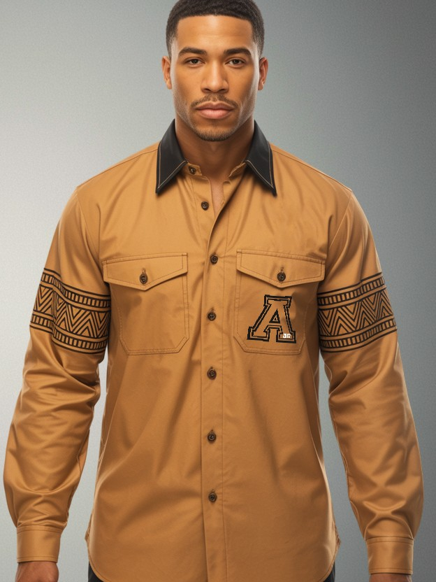 Alpha Phi Alpha Tan Tribal Long-Sleeve Button-Up Shirt: stylish, made for comfort and fraternity pride with premium materials, unique tribal print, and embroidered Greek letters.