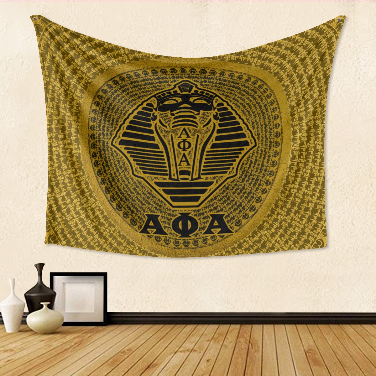 This Alpha Phi Alpha tapestry makes an impressive statement piece in any chapter house or personal space with bold black and old gold designs. Perfect for Alpha Phi Alpha probate gifts or decorating for homecoming celebrations, the soft polyester fabric hangs beautifully anywhere you want to showcase your letters. From The D9 Standard.