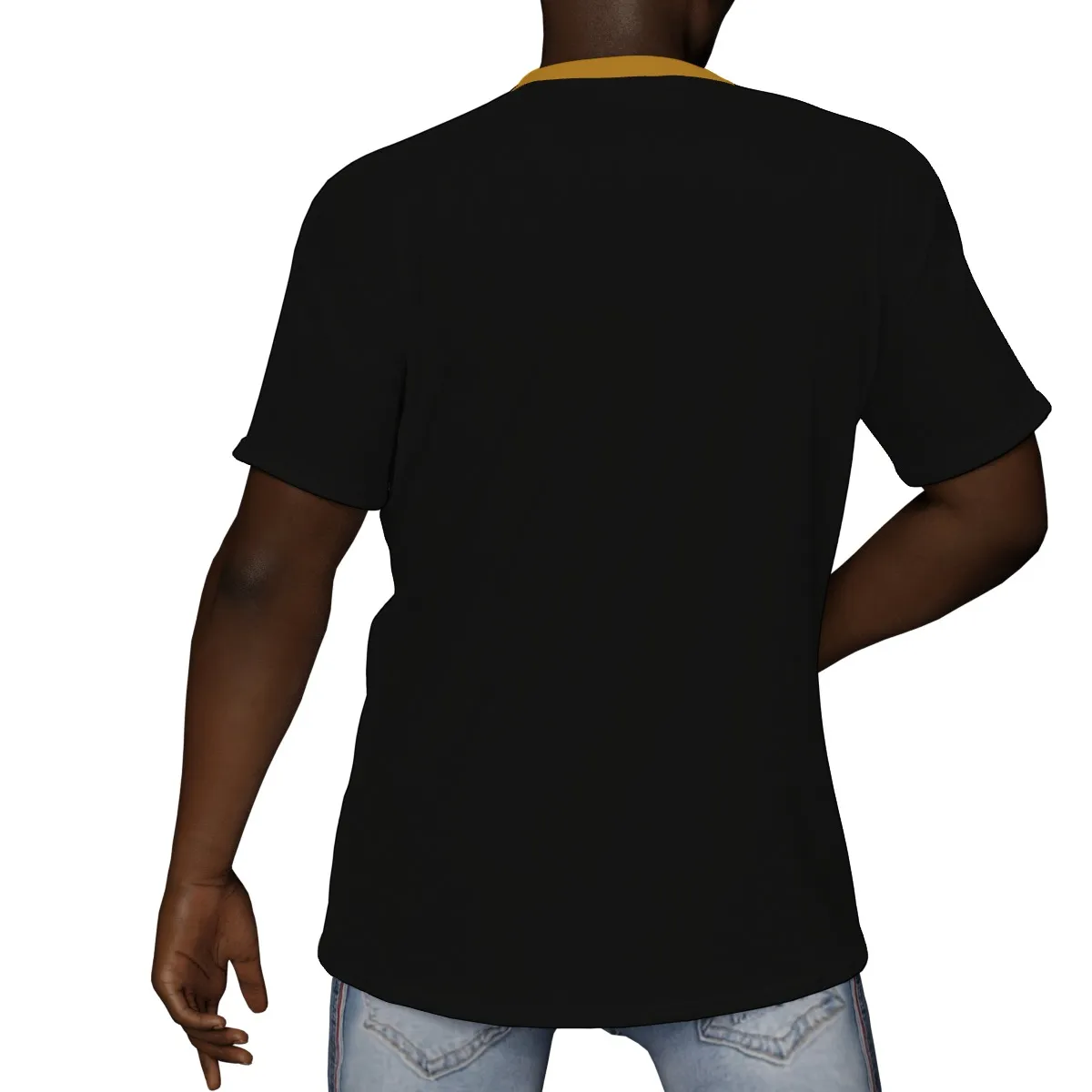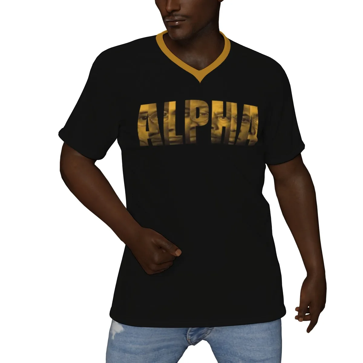 Alpha Phi Alpha men’s V-neck shirt featuring the fraternity’s iconic black and old gold in a breathable polyester-spandex blend. Whether you’re searching for the perfect alpha phi alpha shirt for chapter meetings or alpha phi alpha probate gifts for your newest brothers, this comfortable tee delivers D9 style for any occasion. Exclusively from The D9 Standard.