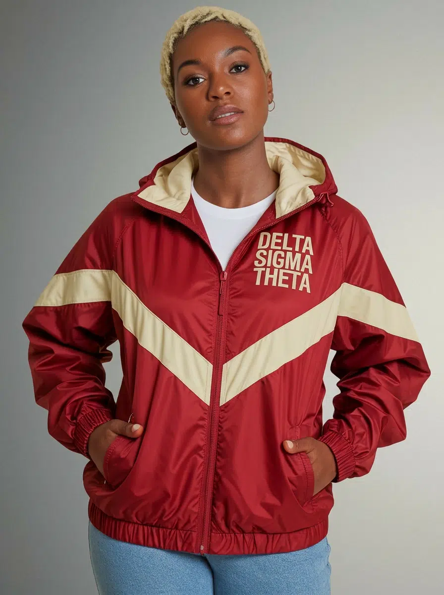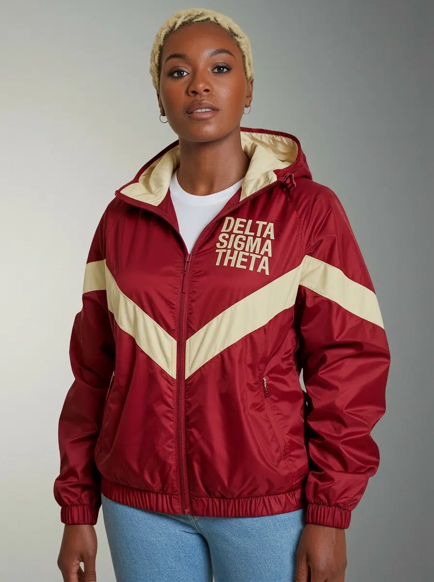 Delta Sigma Theta Classic Sisterhood Windbreaker for women combines the timeless appeal of a varsity jacket with lightweight comfort in crimson and cream. This DST jacket transitions effortlessly from step show rehearsals to chapter meetings, letting you rep your sisterhood with pride. Premium DST paraphernalia from The D9 Standard.