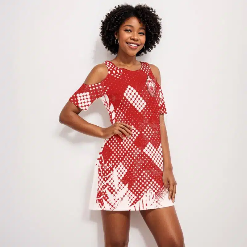 This Delta Sigma Theta women’s cold shoulder dress brings elevated style to your DST paraphernalia collection. Crafted from breathable 190GSM cotton in crimson and cream accents, it’s ideal for chapter brunches, alumni events, or weekend wear. Premium DST merch from The D9 Standard.