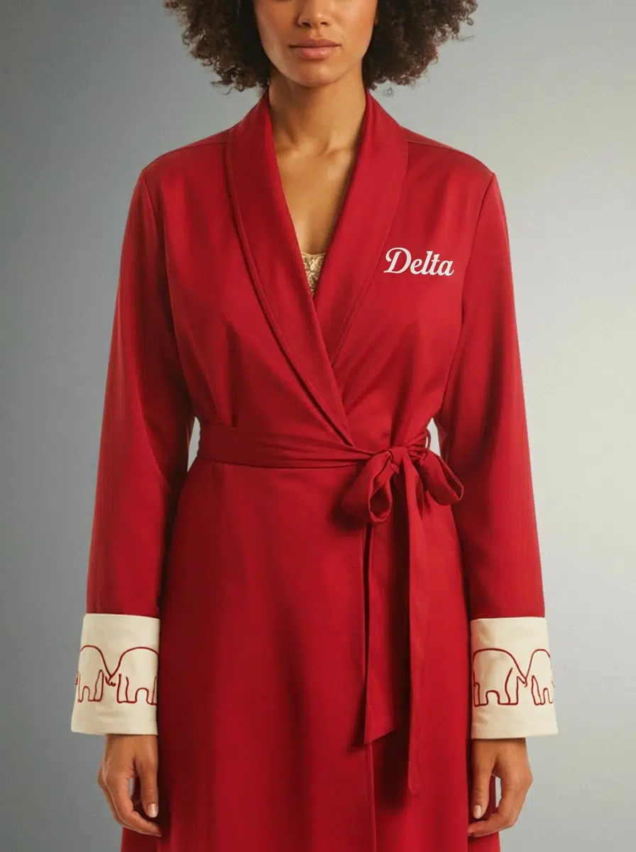 This Delta Sigma Theta women’s cardigan brings sophisticated DST style to any occasion with its flattering belted wrap silhouette in classic crimson and cream tones. Whether you’re heading to chapter meetings or brunch with your sorors, this DST paraphernalia piece delivers effortless elegance. The D9 Standard.