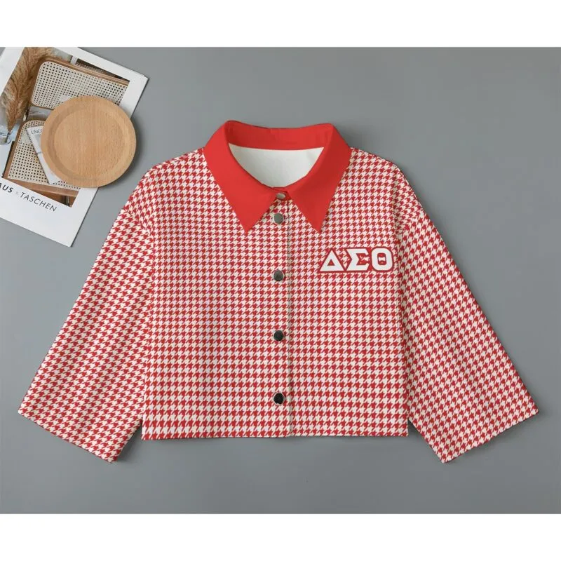 This Delta Sigma Theta cropped jacket brings varsity-inspired style to your DST wardrobe with a flattering silhouette in signature crimson and cream. Rock this versatile Delta Sigma Theta jacket to chapter meetings, tailgates, or weekend brunches when you want that perfect blend of comfort and sorority pride. The D9 Standard.
