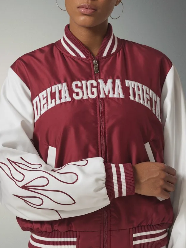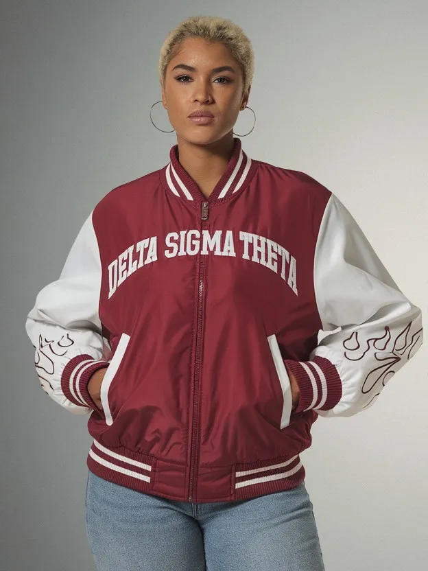 The Delta Sigma Theta Torch Wisdom Bomber Jacket brings sorority pride to every occasion with its striking crimson and cream design. This DST bomber jacket showcases the iconic torch symbol, making it ideal for chapter meetings, step shows, and weekend events. Represent your letters in style with The D9 Standard.
