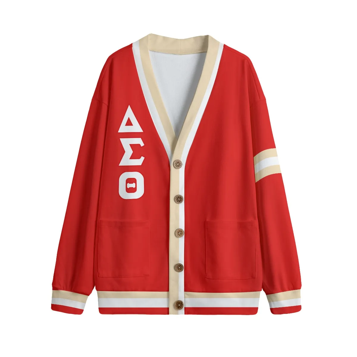 This Delta Sigma Theta women’s cardigan features premium knitted fleece in crimson and cream accents, perfect DST paraphernalia for chapter meetings and professional events. Button-front styling keeps you warm while repping your letters with sophistication. Exclusively from The D9 Standard.