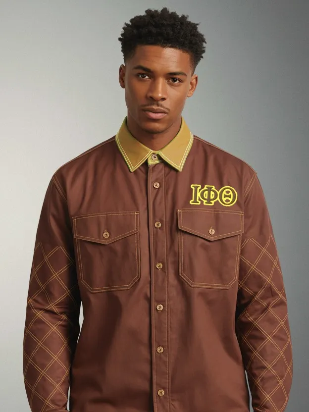 This Iota Phi Theta men’s long-sleeve button-up shirt showcases your fraternity pride with a striking two-tone crest in charcoal brown and gilded gold. Whether you’re searching for distinguished iota phi theta shirts for chapter formals or quality iota phi theta paraphernalia for brotherhood events, this polished design delivers. Exclusively at The D9 Standard.