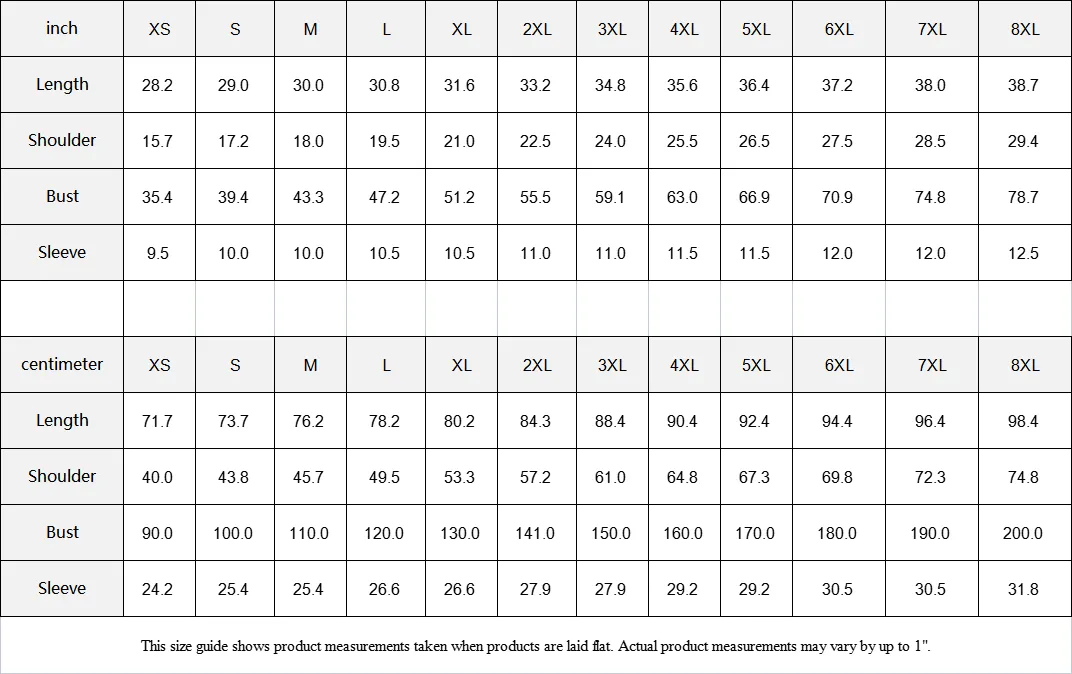 | centimeter | XS | S | M | L | XL | 2XL | 3XL | 4XL | 5XL | 6XL | 7XL | 8XL |