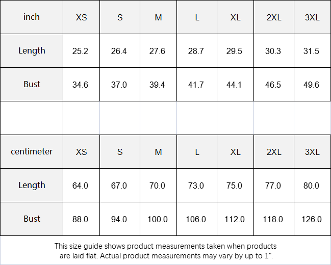 inch XS S M L XL 2XL 3XL