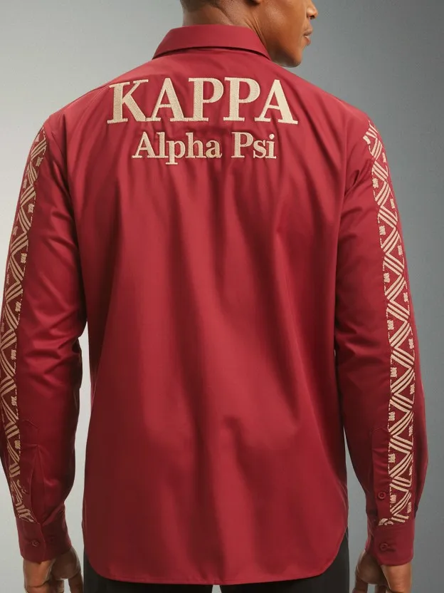 This Kappa Alpha Psi long-sleeve shirt features a crimson plaque design, comfortable button-up style, great for showcasing your fraternal pride and commitment in style.