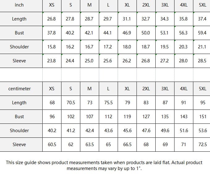 | centimeter | XS | S | M | L | XL | 2XL | 3XL | 4XL | 5XL |