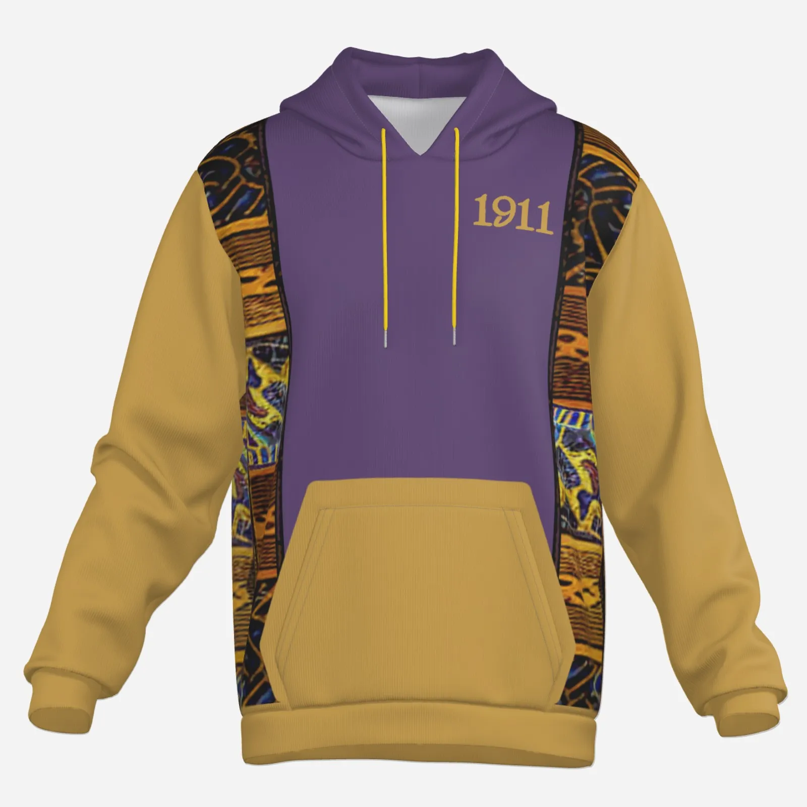 Omega Psi Phi men’s hoodie featuring bold African patchwork in signature purple and gold. This omega psi phi hooded sweatshirt delivers standout style for step shows, campus life, and chapter events. Premium omega psi phi paraphernalia from The D9 Standard.