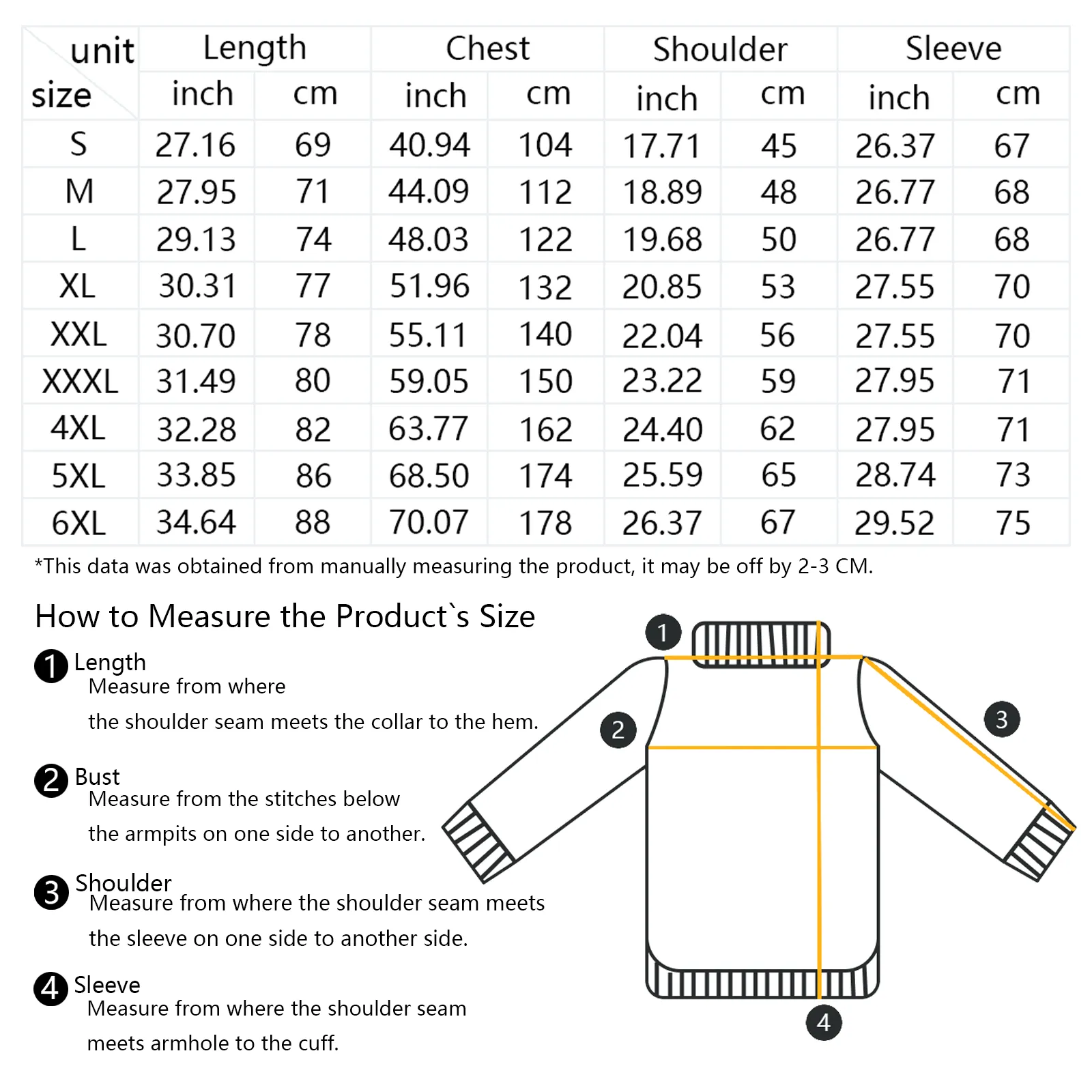 The measurement data of this size is obtained by laying clothes flat. Due to different measurement methods, it is normal that the error is within 2-3cm.