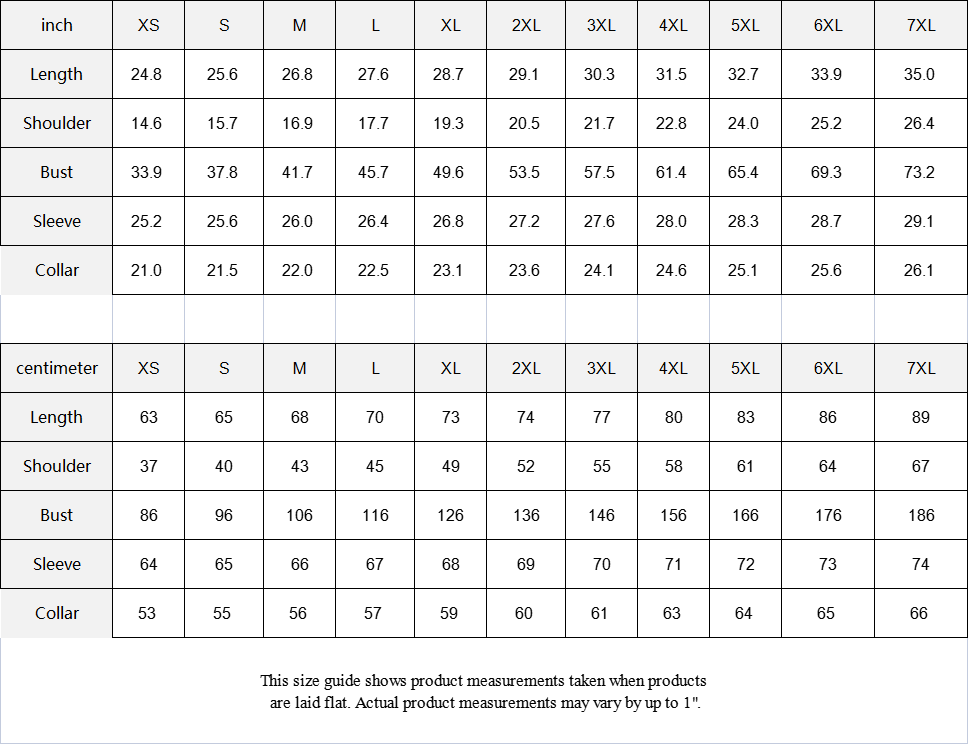 | centimeter | XS | S | M | L | XL | 2XL | 3XL | 4XL | 5XL | 6XL | 7XL |