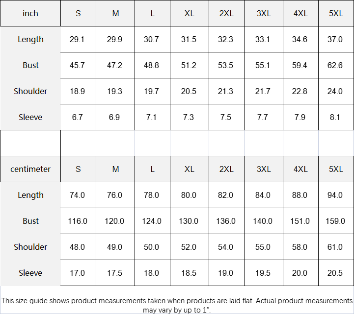 | centimeter | S | M | L | XL | 2XL | 3XL | 4XL | 5XL |