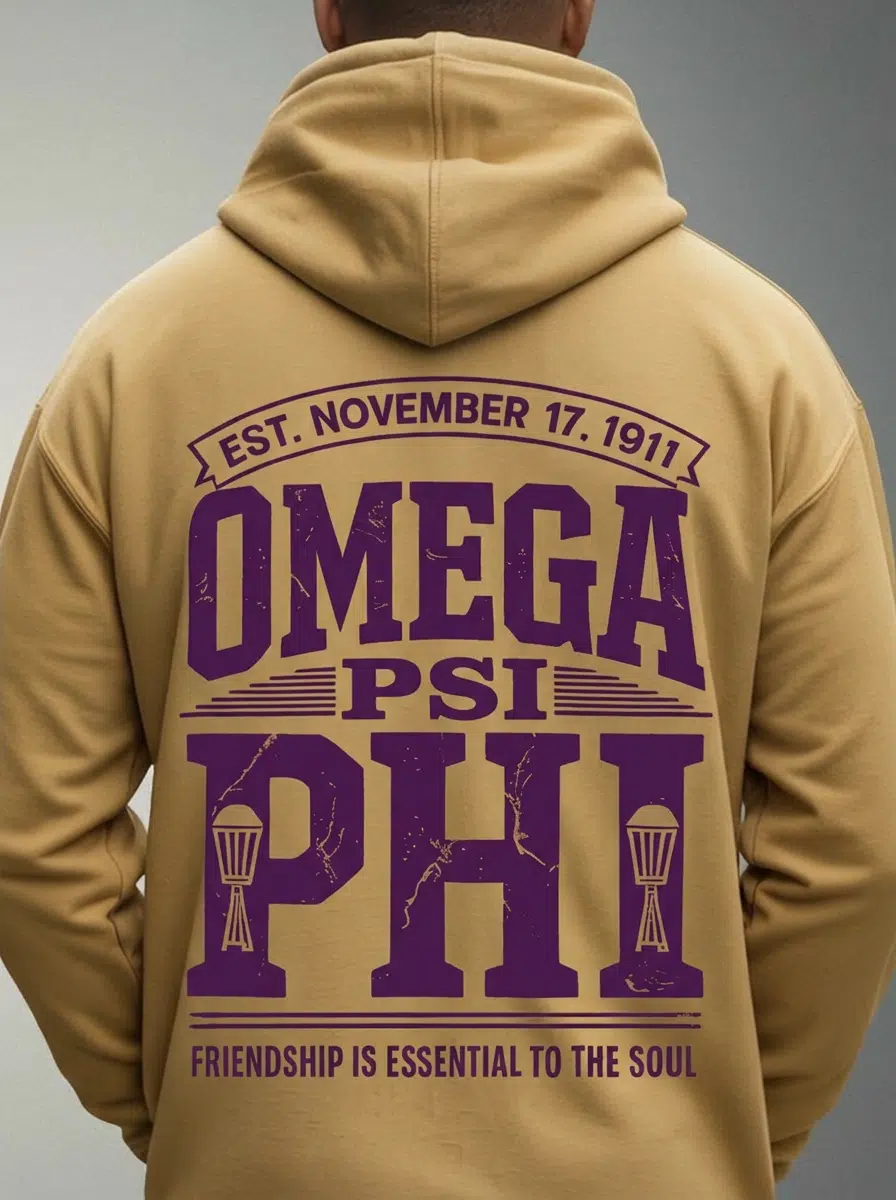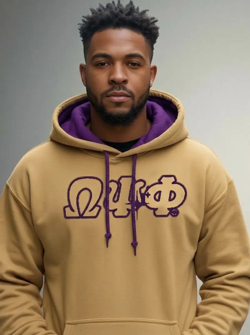 Omega Psi Phi men’s hoodie featuring bold wordmark styling in the fraternity’s signature purple and gold. This premium omega psi phi sweatshirt delivers comfort and brotherhood pride for chapter meetings, homecoming weekend, or campus life. Authentic omega psi phi paraphernalia from The D9 Standard.