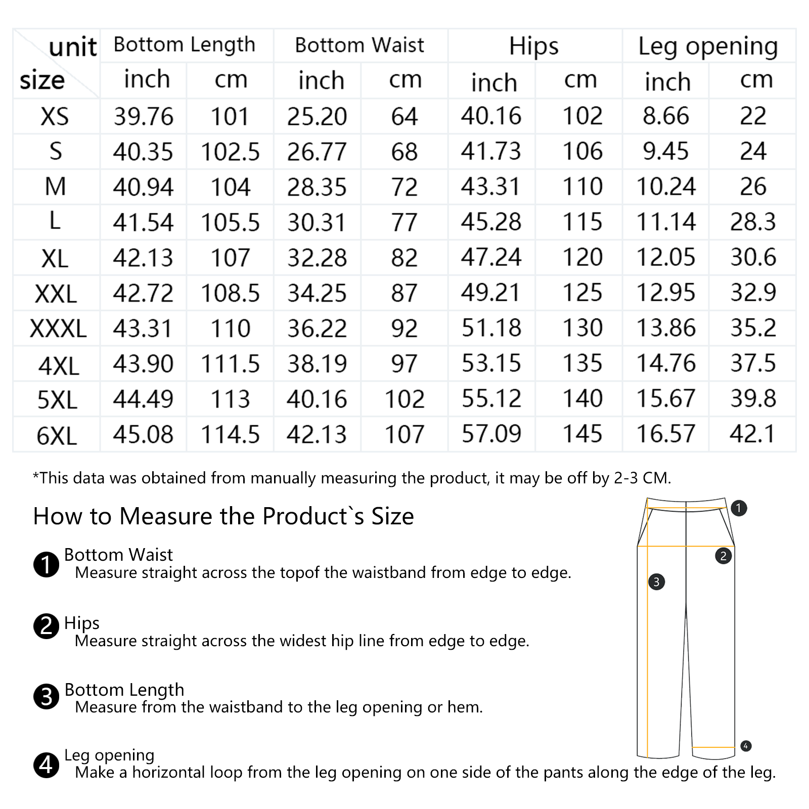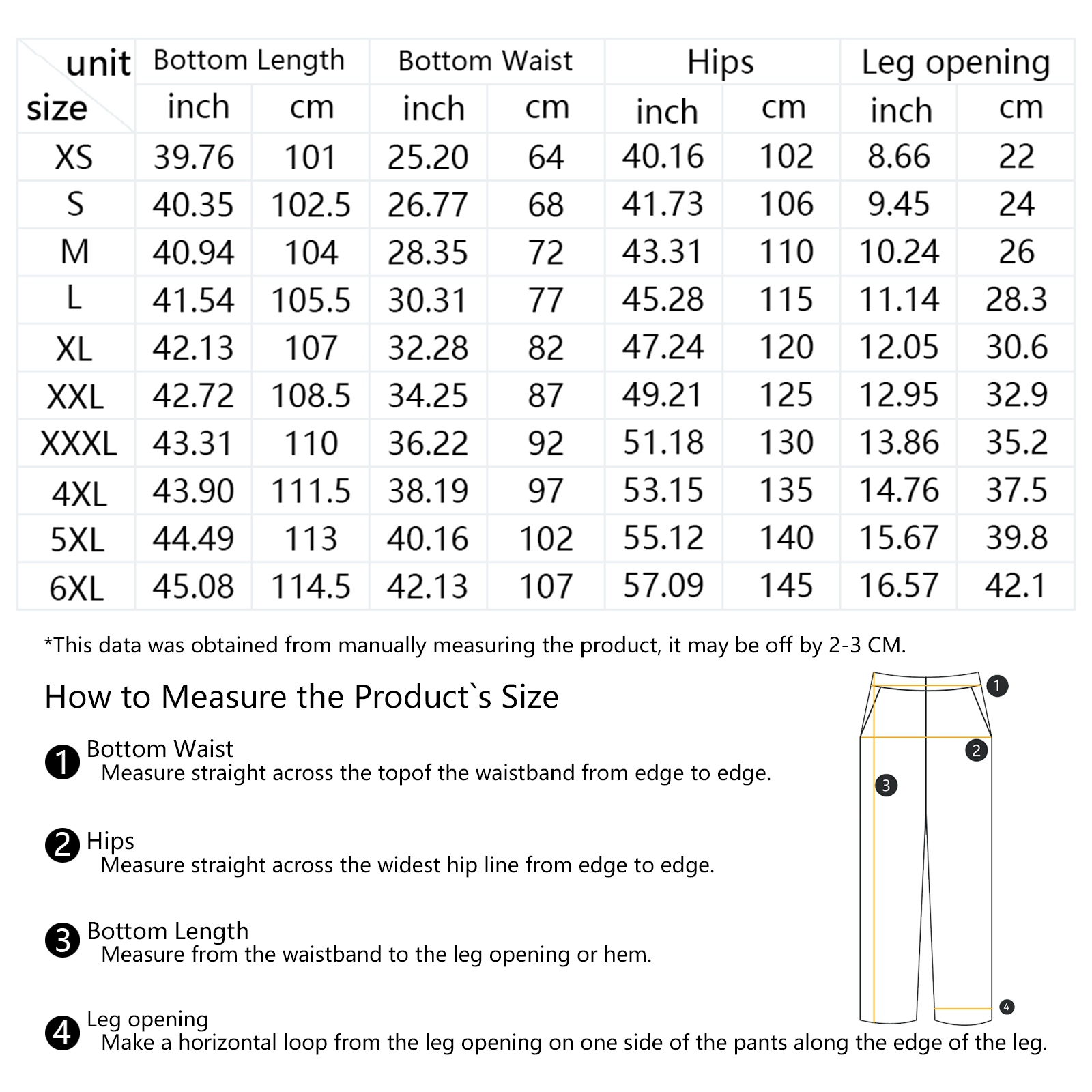 | Size | Bottom Length | Bottom Waist | Hips | Leg opening |