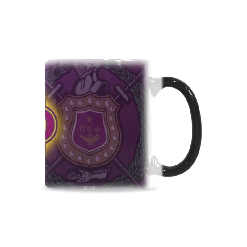 This Omega Psi Phi changing mug reveals its hidden design when filled with hot liquid, making it standout omega psi phi paraphernalia for morning coffee at the office or chapter meetings. The heat-activated ceramic showcases your purple and gold pride with every sip. From The D9 Standard.