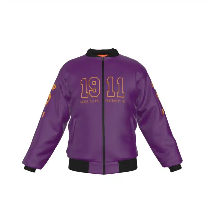 Omega Psi Phi men’s bomber jacket featuring the fraternity’s iconic purple and gold in a sleek, customized design. This premium omega psi phi paraphernalia keeps you warm at chapter events, tailgates, and step shows with windproof polyester and functional pockets. Represent the Ques in style with The D9 Standard.