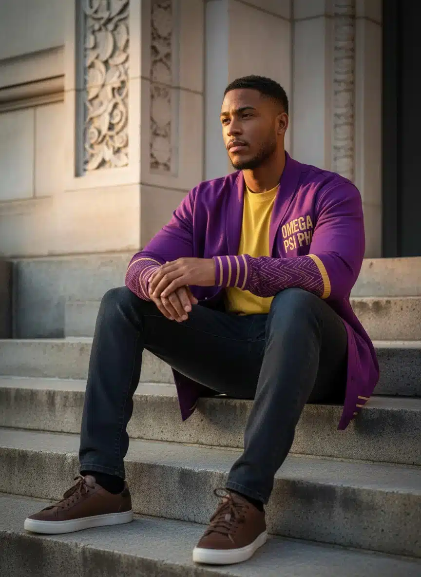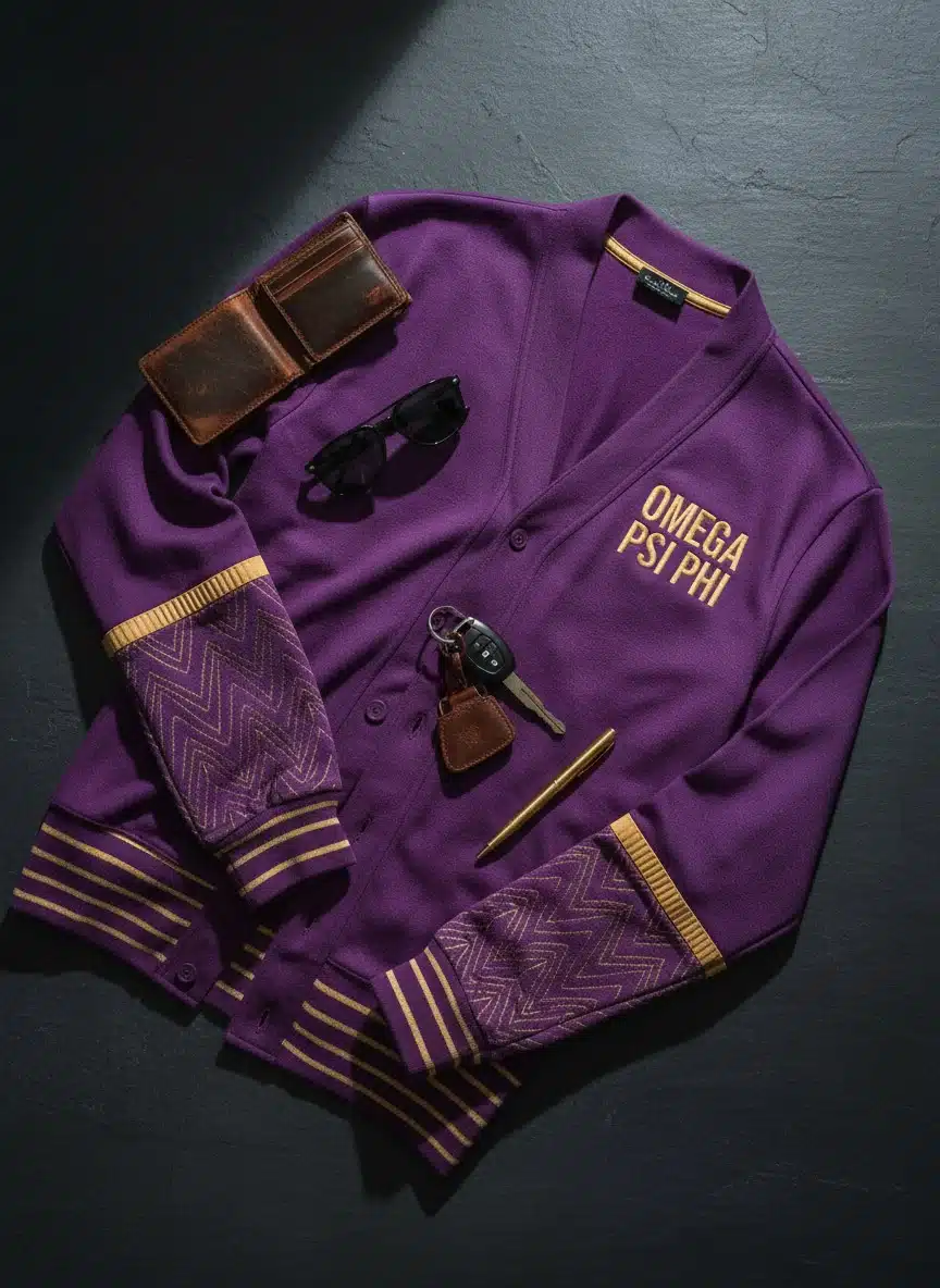 Omega Psi Phi men’s cardigan blending signature purple and gold with refined style. This comfortable layering piece stands out at chapter meetings and professional events alike, making it essential omega psi phi paraphernalia for Ques who value tradition. Exclusively at The D9 Standard.