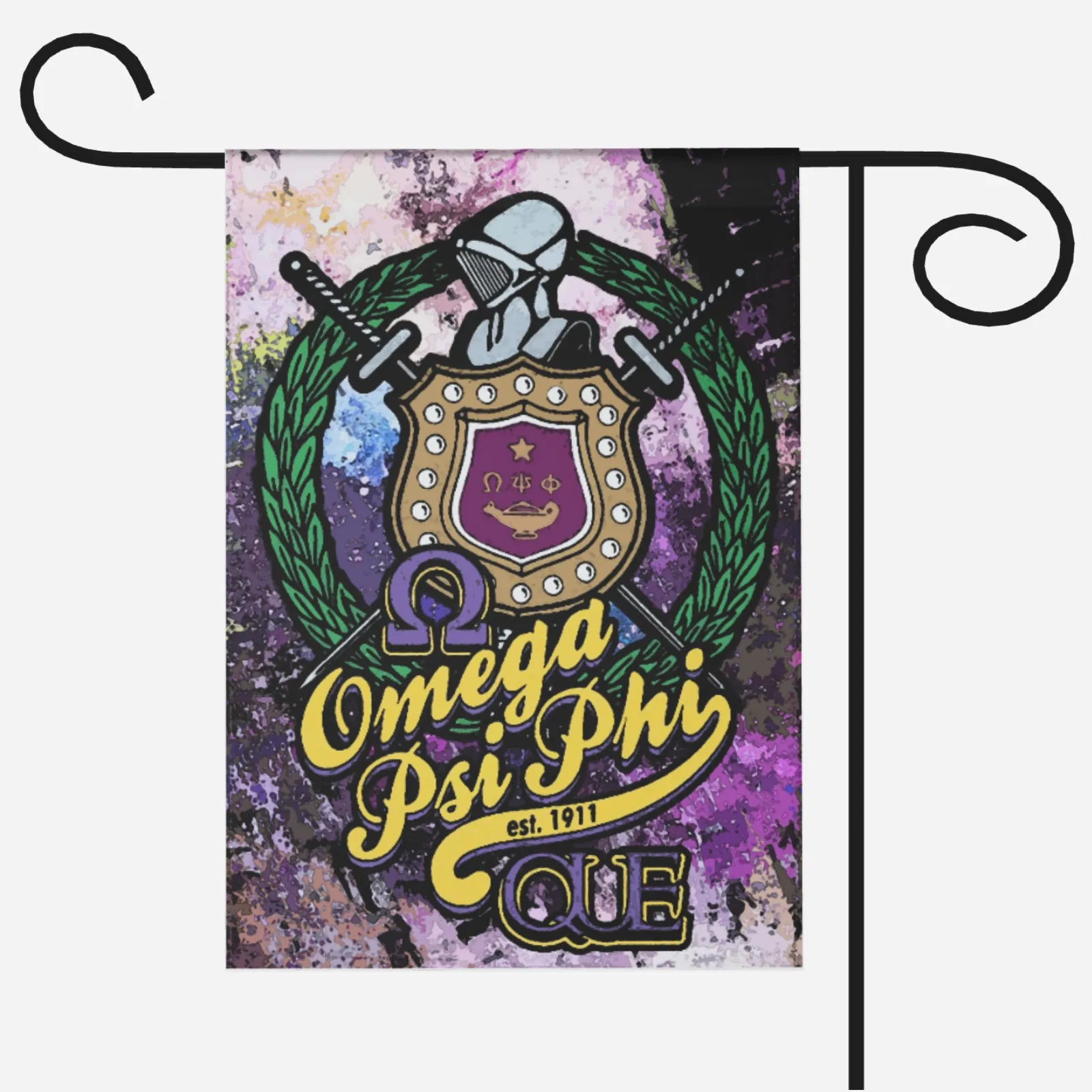 Omega Psi Phi Fraternity Flag featuring the iconic purple and gold colors of the Ques. This premium omega psi phi paraphernalia makes a bold statement at chapter houses, yard shows, and homecoming tailgates. Elevate your omega psi phi gifts collection with authentic D9 pride from The D9 Standard.