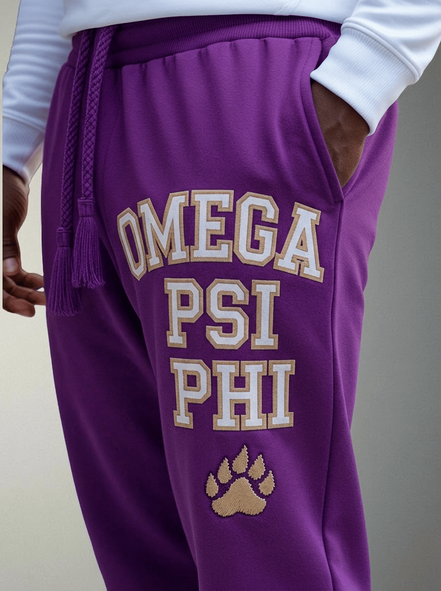 Omega Psi Phi men’s jogger sweatpants designed for Ques who demand comfort without sacrificing fraternity pride. The soft fleece construction showcases your purple and gold at step shows, campus events, or weekend lounging. When brothers search for premium omega psi phi paraphernalia, they find The D9 Standard.