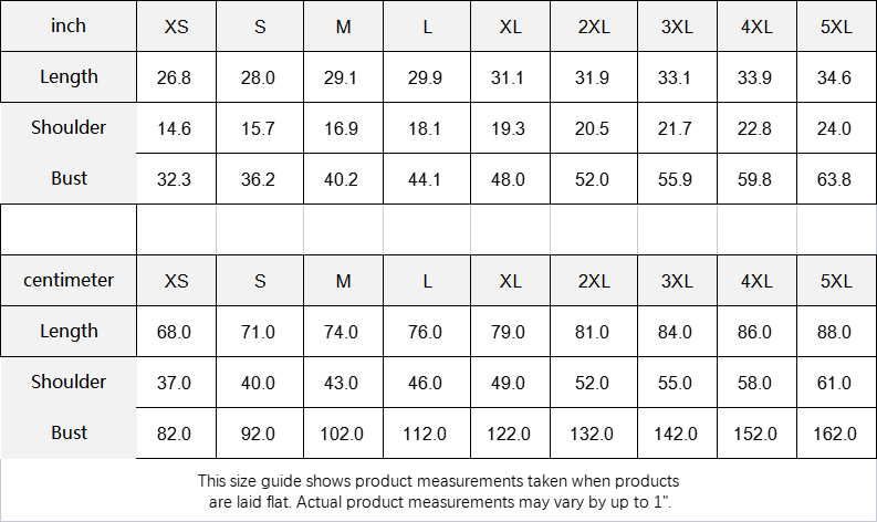 inch XS S M L XL 2XL 3XL 4XL 5XL