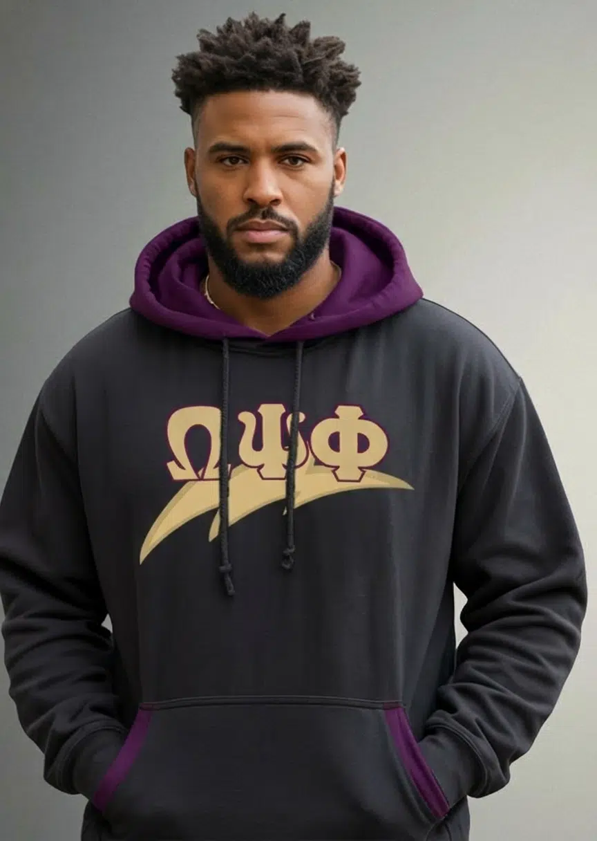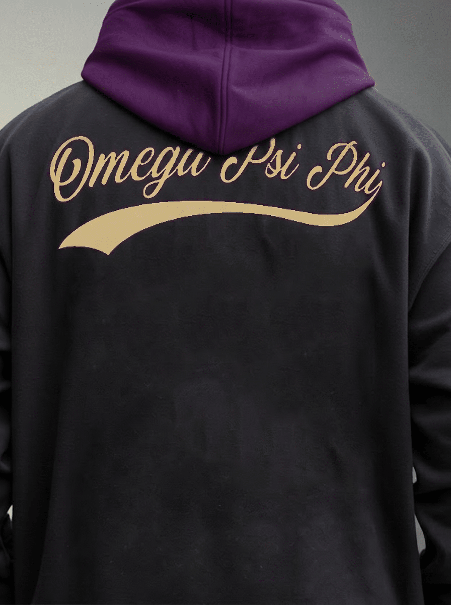 Omega Psi Phi men’s hoodie featuring bold script banner design in signature purple and gold. This premium omega psi phi sweatshirt delivers comfort and style for step shows, chapter meetings, and game days. Exceptional omega psi phi paraphernalia from The D9 Standard.
