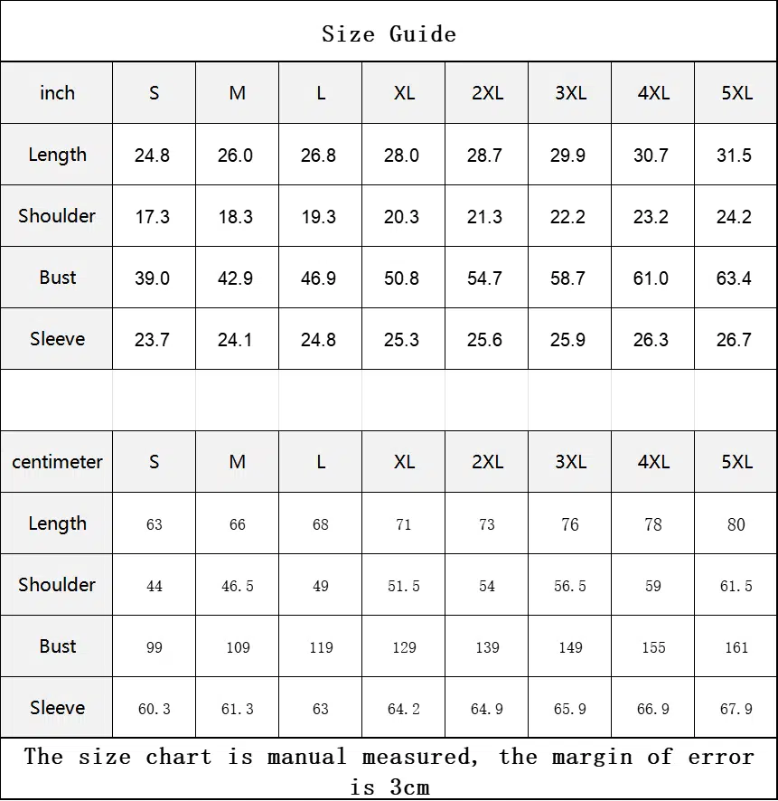| centimeter | S | M | L | XL | 2XL | 3XL | 4XL | 5XL |
