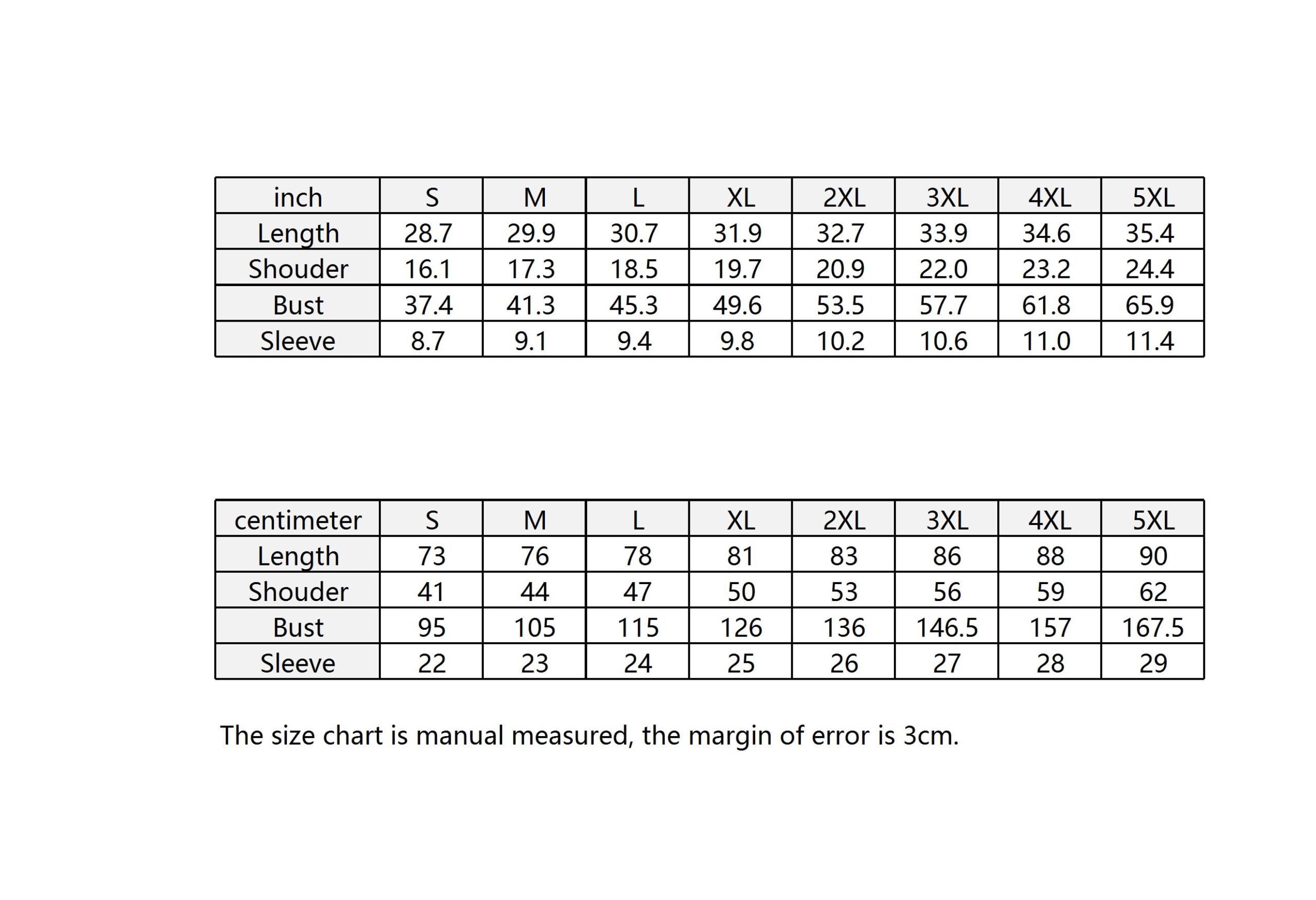 | centimeter | S | M | L | XL | 2XL | 3XL | 4XL | 5XL |