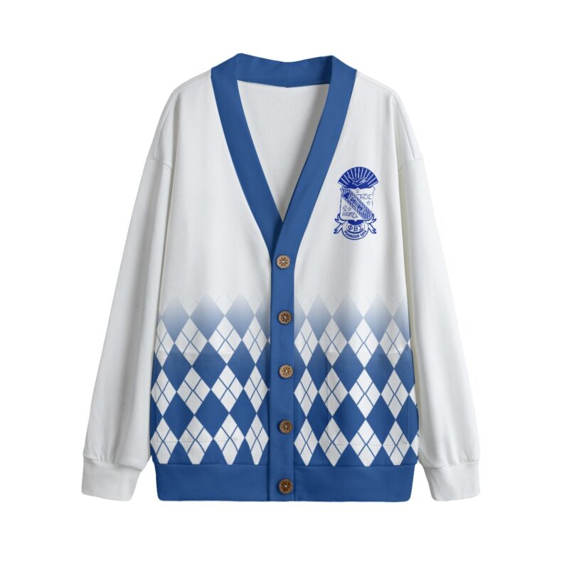 Phi Beta Sigma men’s fleece-lined cardigan with bold all-over print in royal blue and white. This premium Phi Beta Sigma paraphernalia piece features button closure and knitted texture perfect for chapter meetings, homecoming tailgates, or casual campus days. Represent the Sigmas in style with The D9 Standard.