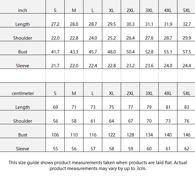 | centimeter | S | M | L | XL | 2XL | 3XL | 4XL | 5XL |