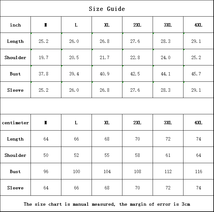 The size chart is manual measured, the margin of error is 3cm