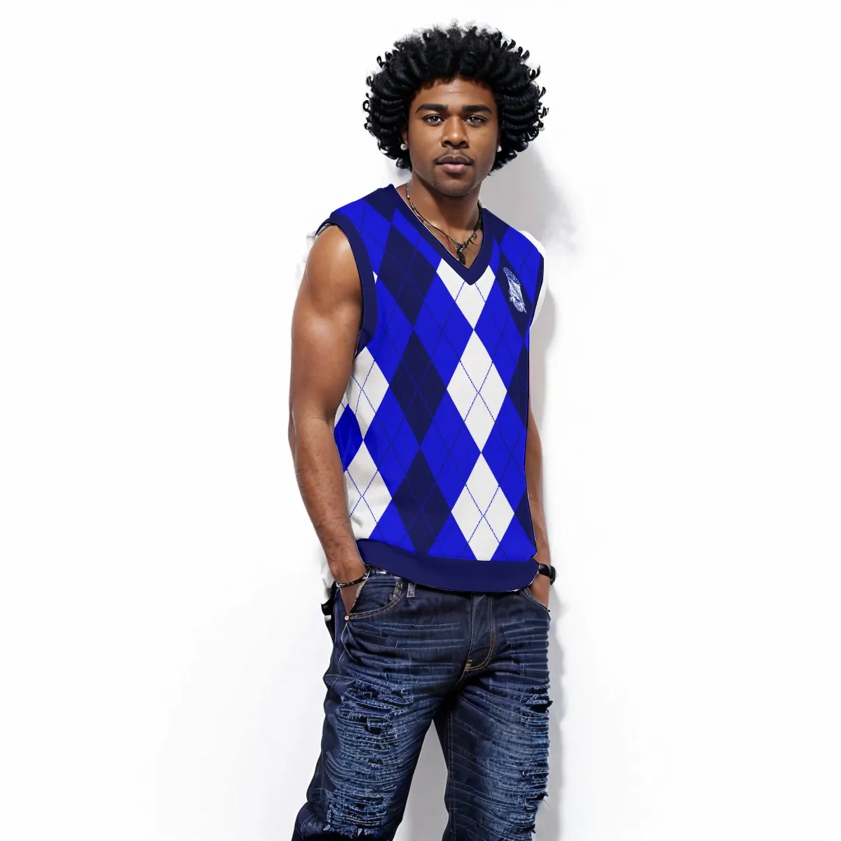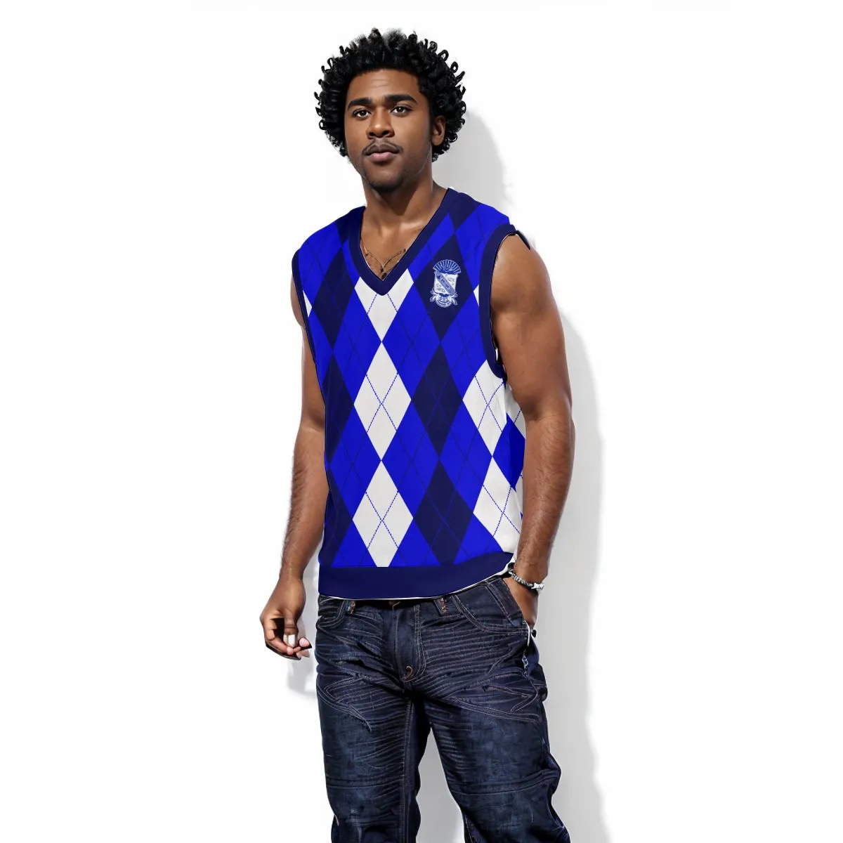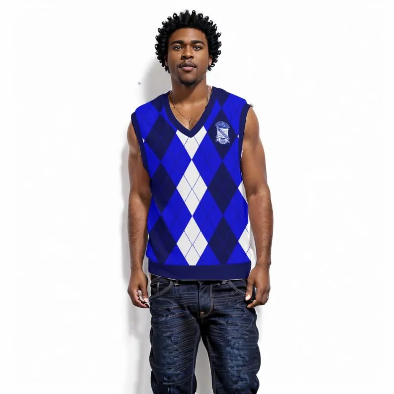 Phi Beta Sigma men’s Christmas vest that brings festive flair to your Phi Beta Sigma paraphernalia collection. This sleek polyester v-neck features your fraternity’s royal blue and white in a holiday-ready design perfect for Sigma chapter Christmas parties and seasonal gatherings. Premium Phi Beta Sigma merch from The D9 Standard.