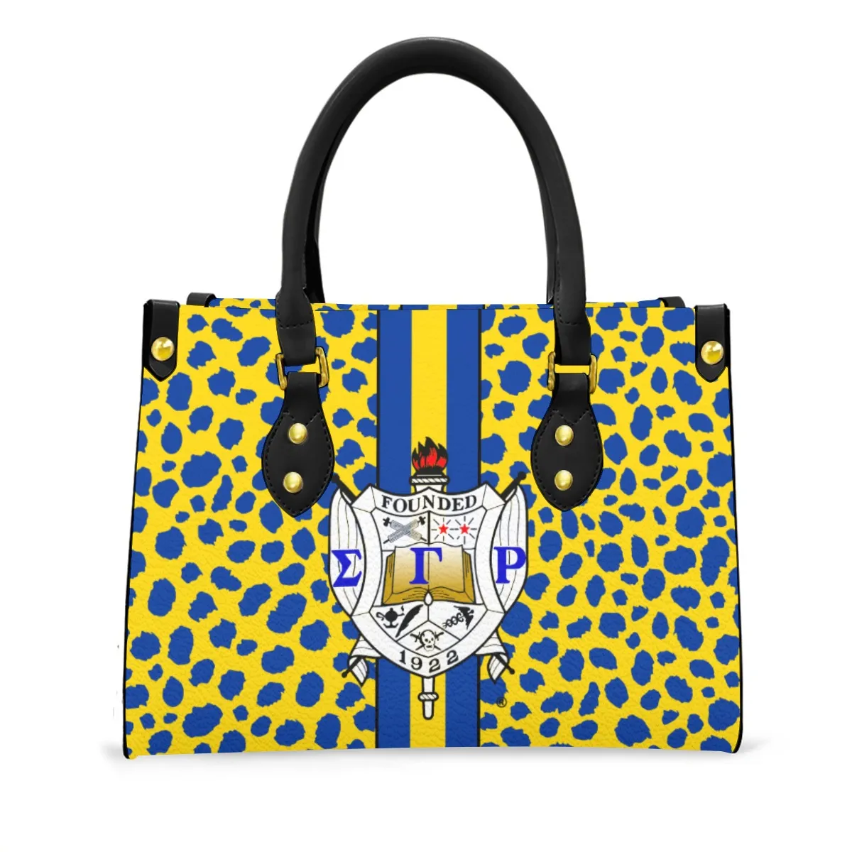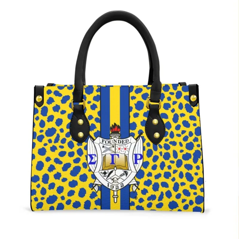 Sigma Gamma Rho tote bag with black handle that brings royal blue and gold pride to every outing. Spacious enough for chapter meetings, campus life, or weekend getaways, this SGRho paraphernalia piece features a zippered interior pocket to keep essentials secure. Quality sgrho gifts from The D9 Standard.