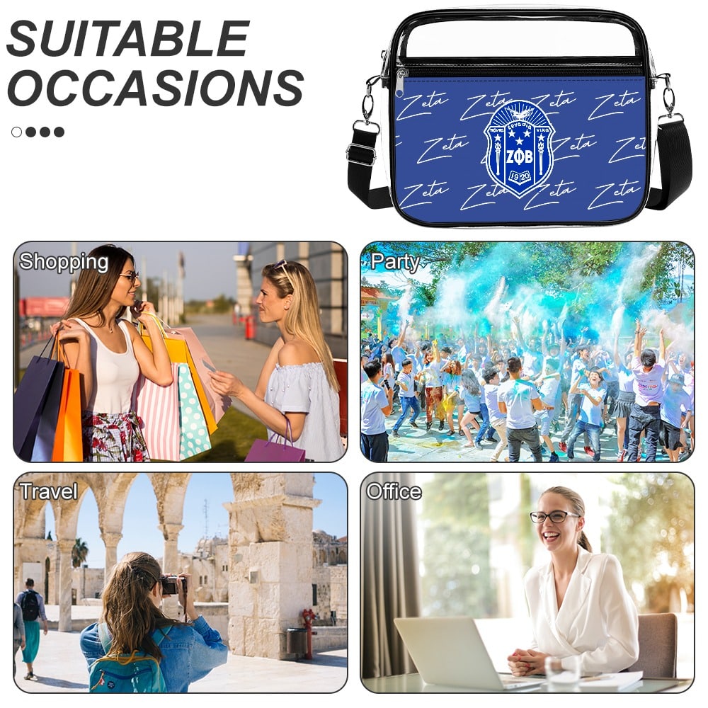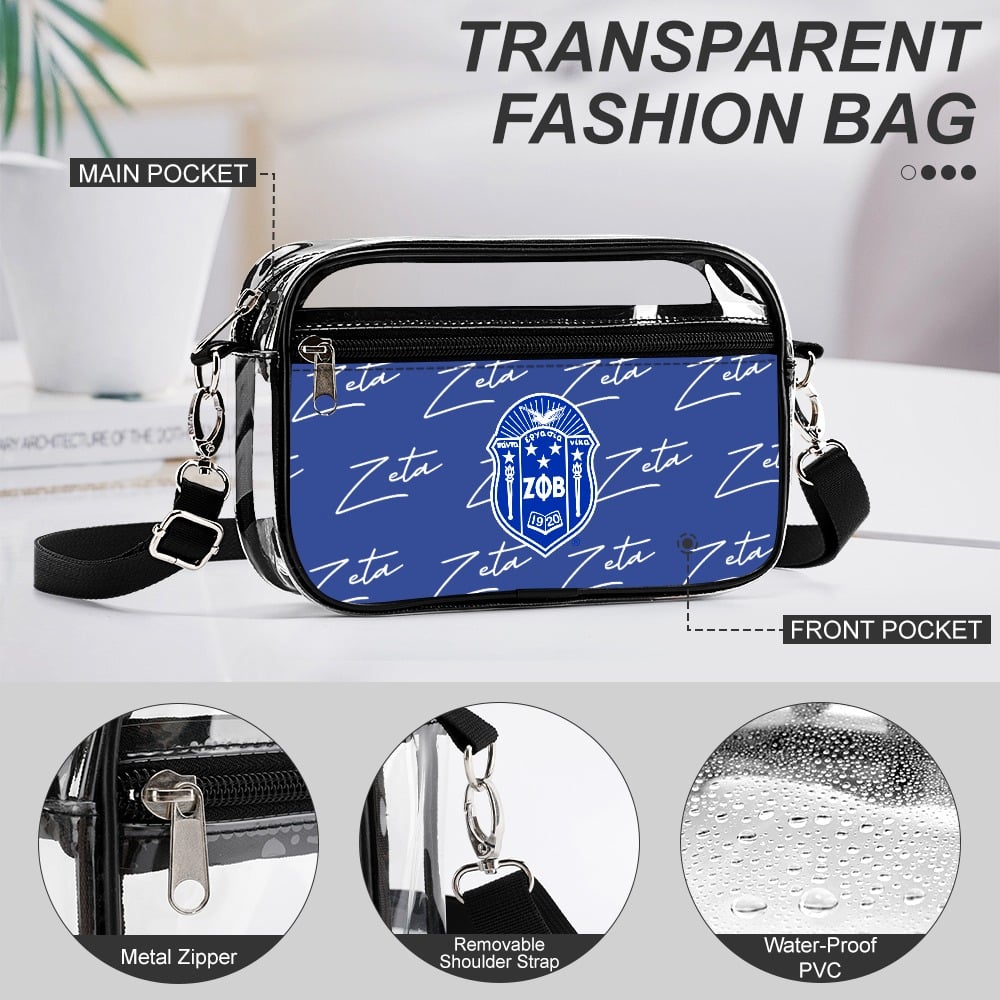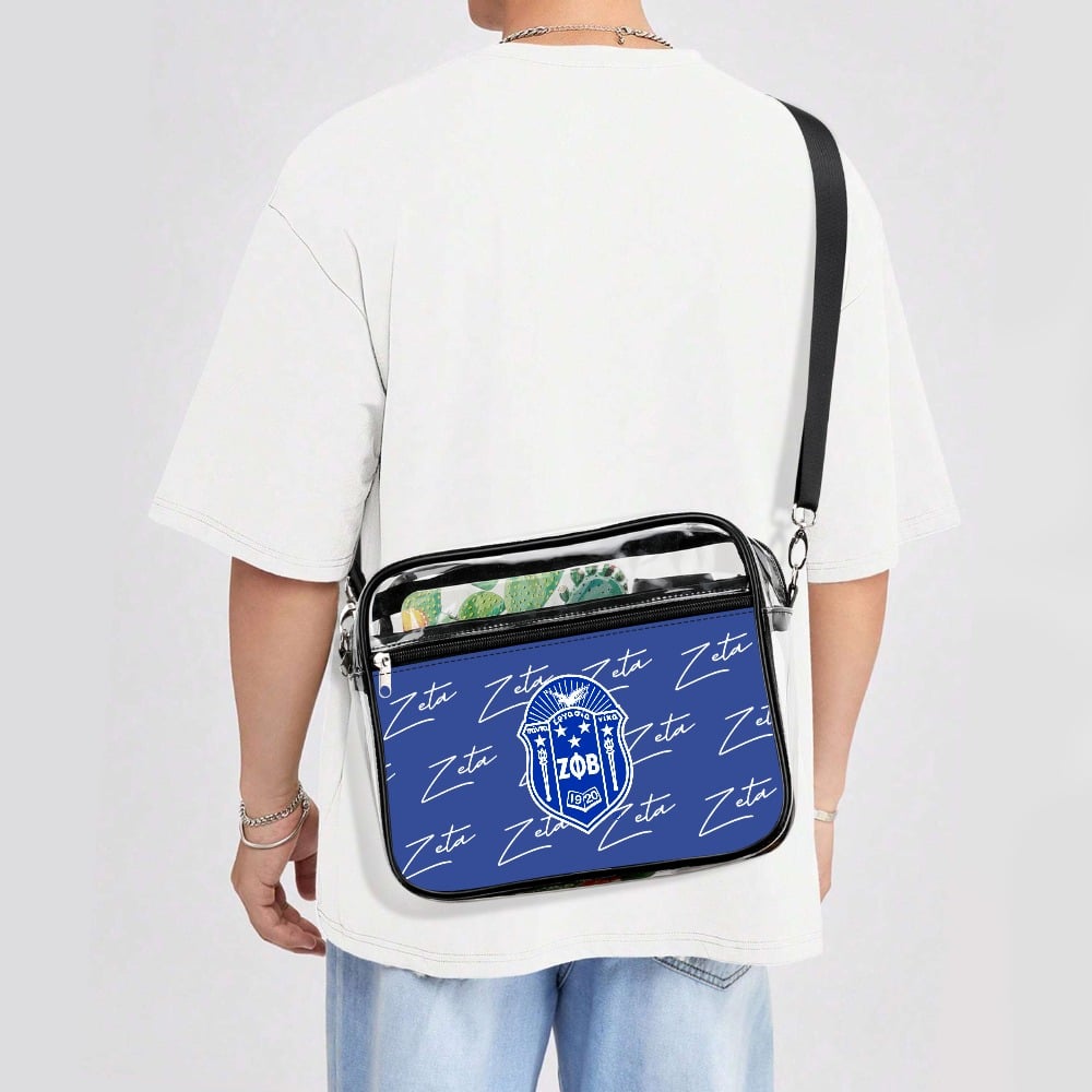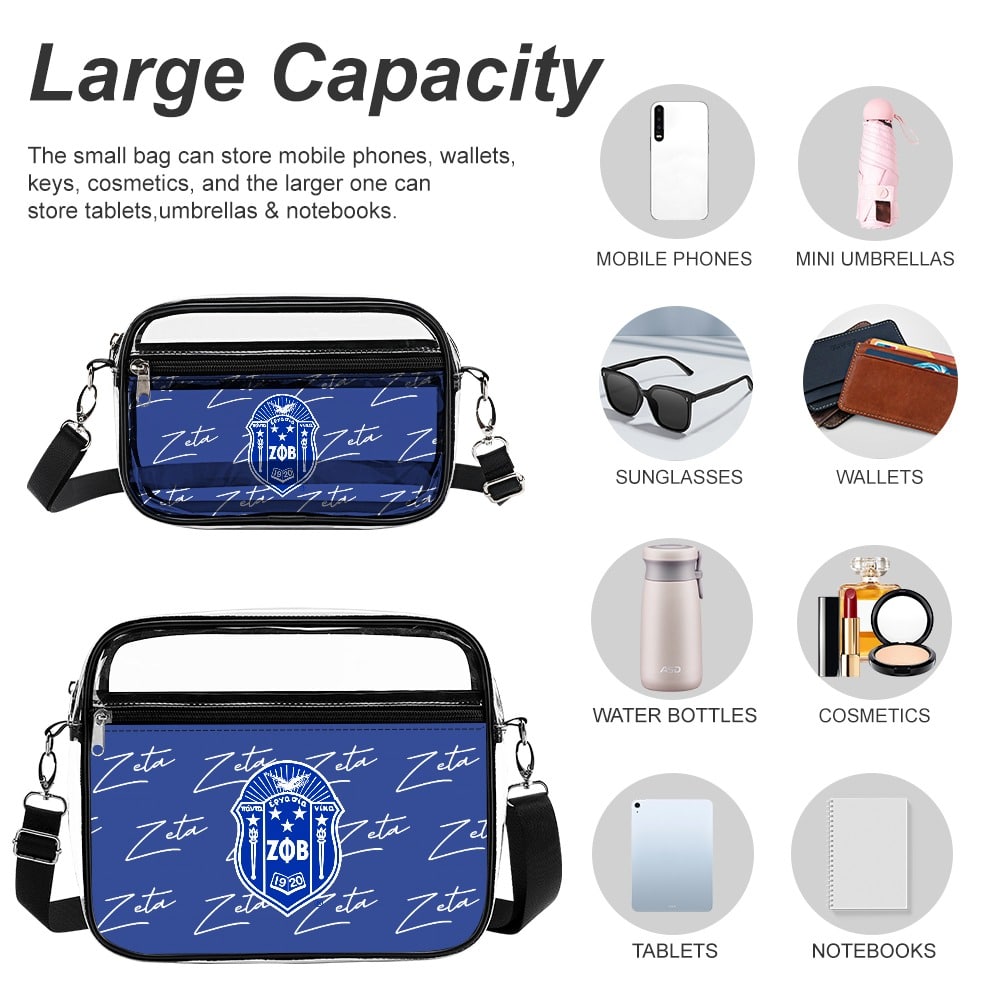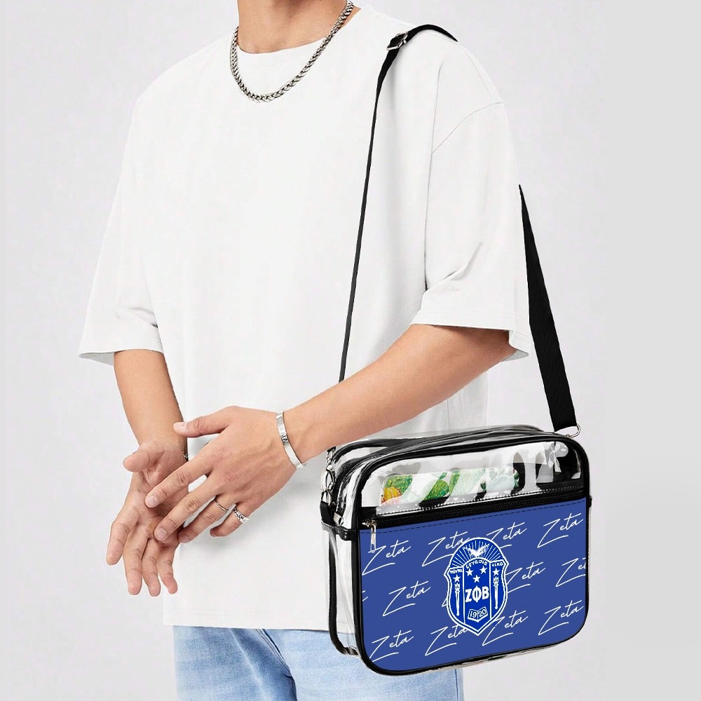 Zeta Phi Beta women’s two-piece transparent satchel set keeps your essentials organized in royal blue and white style. This versatile zeta phi beta paraphernalia works beautifully for chapter meetings or makes an thoughtful zeta phi beta probate gift. Represented with pride by The D9 Standard.